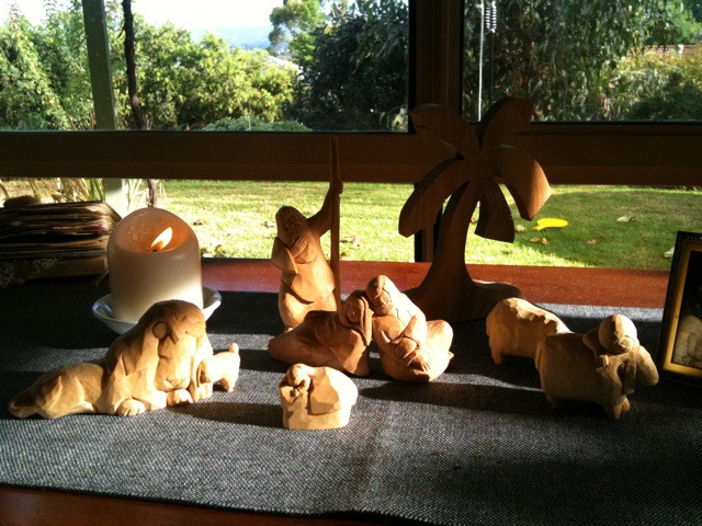 The Cicada’s thrum usually heralds Christmas, but instead this year’s acridid pestilence is lending our town an unwholesome, apocalyptic atmosphere; and the Post Office had all the ambiance of a bunker, sheltering its insect-shocked clientelle. The sender’s name on my American parcel was a thrill to read, and brought to mind the lead up to a Christmas past when my Favourite Wife and I were listlessly allowing our conversation to spiral into a malaise of discontent. It wasn’t really a conversation; more a staccato exchange of bleak complaints. How miserable! Truth be told, we didn’t have so much to worry about, but then anxiety is a subjective affair and our dilemmas were real. Mercifully our deepening gloom was interrupted by a rap on the front door. It was the Postman, delivering the Messiah to our home. Salvation came in a satchel! Jesus Christ, a shepherd, some sheep and the Holy Family arrived on a Postie’s bike. That date, November 20, has become an annual ritual for us. The Christmas Season begins when we unwrap our superbly crafted wooden Nativity, and we remember that irksome Monday’s Postal Epiphany, a profound and simple lesson: God sent his Son to our ordinary world. What, I wondered, had our good friends sent to us this Christmas?