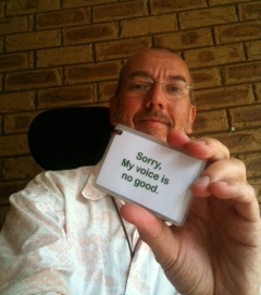 The Gossip. Then, and I really liked this one, there was the driver who followed me down the aisle of the bus to find out more. “Now what have you done to yourself? Where’s your voice gone? Aren’t you going to talk to me today?” All I could do was smile, shrug, and produce my little card once more.