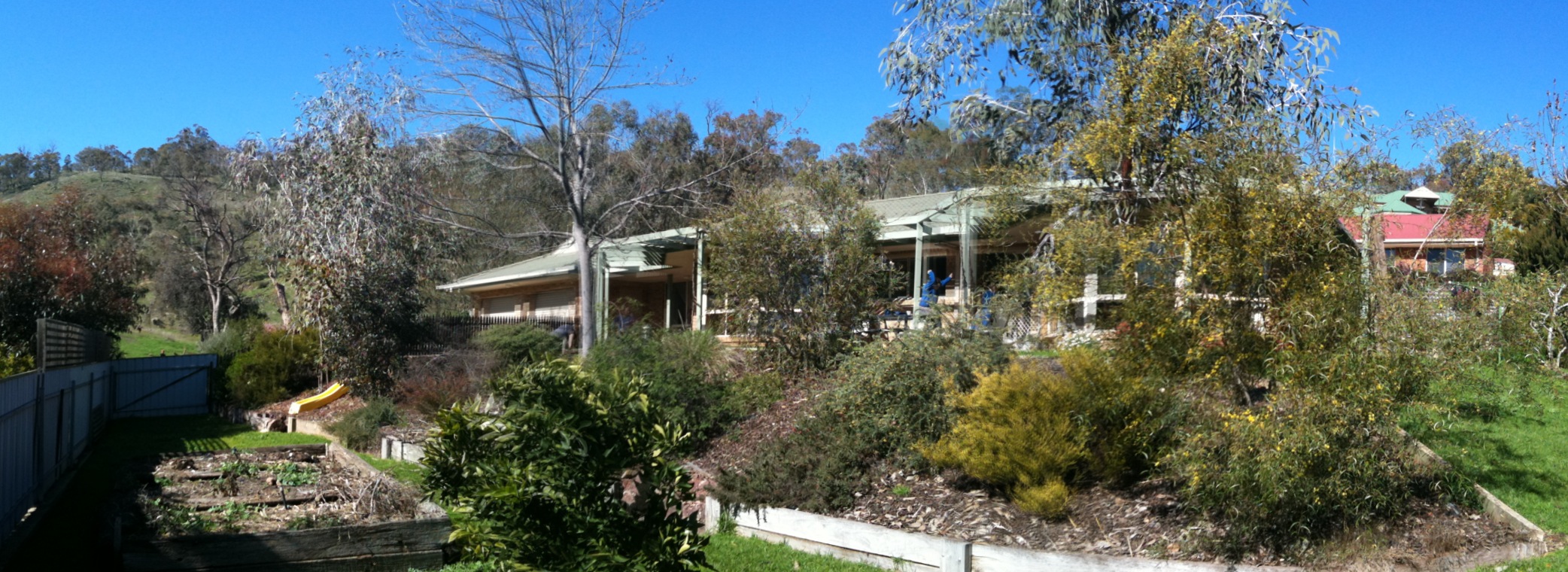 A level home, gracefully designed, beside a lightly timbered hill-side in a quiet cul-de-sac. Bay windows face due north, catching every drop of winter sun, shaded by luxurious grape vines through the summer. It is impossible not to be drawn into Paradise. Friends and visitors remark on its warmth, and on its fabulous setting. Small details confirmed to us (in that ‘signs and wonders’ style to which I am deeply attached!) that we were in the right place. The street we drive up is called “Balmoral”, the name of our favourite beach, on which my Best Girl and I grew up as kids. The house has just one key which opens every door – a feature that I had built into our former house at some expense because our Little One will wander, and we must lock every door. A line of Silver Princess Gums, a favourite tree, wanders through the block. And we have a glorious view: our Kangaroo-spotted hill during the day; and the twinkling lights of the town below at night. It brings to mind a saying from a good friend’s South African family: “Somewhere to look away from your breakfast”.