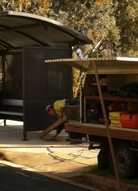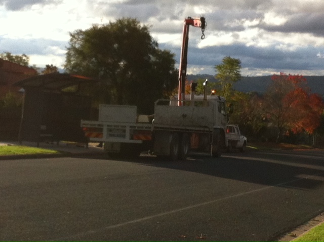 When I first wrote about the pouring of the concrete bus shelter slab on a Spring day in 2011, I did not imagine that it would be quite this long before work resumed. But now, as then, progress has come at an opportune time; a moment of coincidental, personal significance. Back then I wrote about the council as ‘Agents of Divine Providence’, sent (unknowing) to remind me that the world I inhabit is broader than the horizon I see. That message was startling and reassuring just as I was about to journey southwards by train with my Favourite Wife, into the uncertainty of another hospital admission. Today I can’t describe the circumstances that make the workmen’s reappearance equally significant – believe me, it is. Curiously I would not have witnessed the actual installation if I hadn’t missed the previous bus by a whisker; forcing me to return home muttering and grumbling about the failings of public transport (knowing full well that it was me running late, not the bus). More than mere coincidence, the sight of a crane an hour later was a word in season on a very challenging day: “Don’t give in, there are journeys to be made, a mission to accomplish, no matter how unlikely it may feel”.