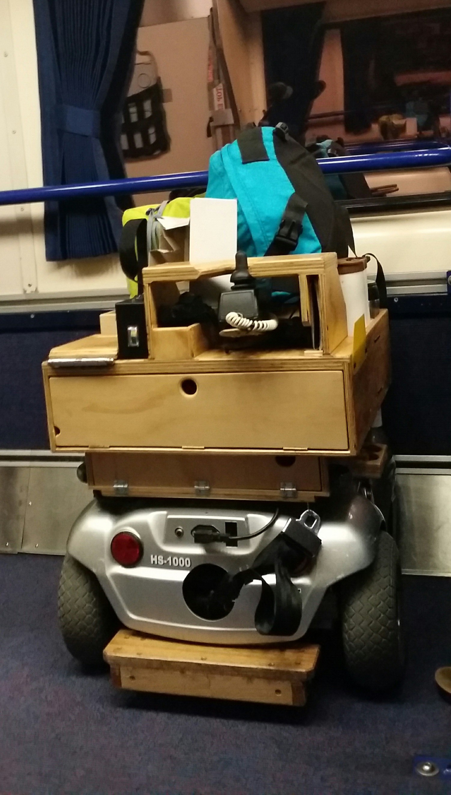So, here I am on-board the train bound for Brisbane, ten twenty-sevenths down, seventeen twenty-sevenths ahead. One 4.5 AH battery spent, as expected, so far so good! If my maths is wrong, or if something brakes down, there is a fail-safe system as well, built into what used to be a power wheelchair (a story for another day). The ‘Tractor’ for want of a better name, is sitting across the isle of the train and contains a complete spare system that I rarely leave home without: a second breathing machine, back up 18 Volt, 24V, and 240V power supplies; spare air hoses, spare masks, a bag of tools, and two 15 AH wheelchair drive batteries. That sounds like a lot of power, but using it will reduce the driving range needed for catching tomorrow’s train from Brisbane to Nambour, and then a bus to Maroochydore. Flat driving batteries would be a nasty setback!