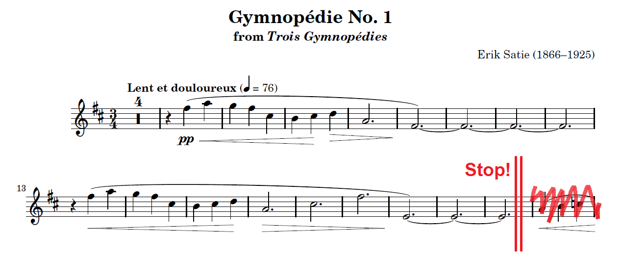 The bottom line: I have, in fact, got my fingers around two octaves in C major, One and three quarters in D major, and mastered the first 22 notes of Satie’s Gymnopēdie No. 1. Well, perhaps not quite mastered.