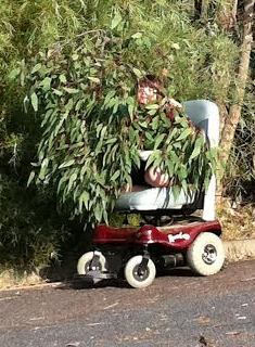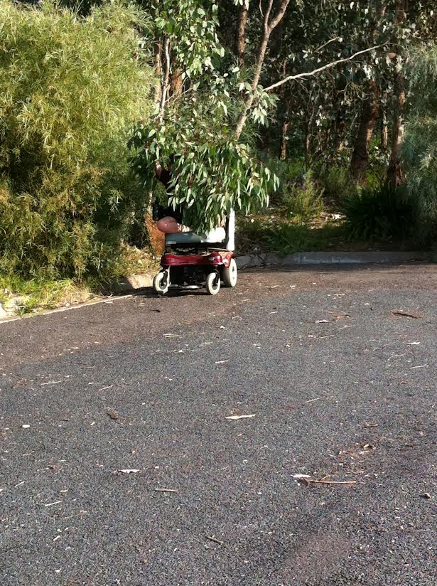 A couple of years back, when “B4” was my transport, Little One (who, having now turned 15, and having ceased being little, I shall now call Teen Girl) and I spent a great many happy afternoons playing various power wheelchair games in our sheltered little cul-de-sac. As a student in a Special School, there is little about driving a wheelchair that my daughter doesn’t know. We played Powerchair Tip most often, and then Duck Duck Goose, Marco Polo, Hide and Seek, and several games with spectacularly complex and wildly variable rules which I suspect Teen Girl made up on the fly. Wheelchair Macro Polo is wacky enough, but Hide and Seek was our strangest game by far, principally because hiding anything in a bitumen cul-de-sac is a challenge, let alone a power chair and teen aged occupant. In fact in our dead end road (and how perfect is it that we should have our very own safe, secluded and wide stretch of tar on which to play?) there is just one spot that could be construed as a hidey-hole: a largish, wayward bunch of gum leaves on a single drooping branch that overshoots the kerb. Every time we played, this is where she hid. Every single time.