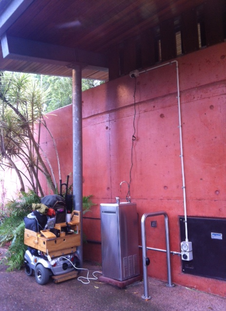One of my daughters was at my side every weekend, and whenever she could after work. She would pass me things, lift things, hold things, run and get things; she was brilliant. Much of the time I could stand in one spot and get a good deal done, sit for a moment, then stand in another spot. The big old Power Chair “B4” was called back into service to travel from the house to the building site, all of 30 feet, where I had several pairs of crutches scattered about. I brought the breathing ventilator on site with linked up air hoses to extend my personal ‘battery life’. Day by day the pool deck grew and grew and grew, and finally at 12 noon on Christmas Eve the council inspector came. It was his last appointment on the very last working day for the year, and having measured all the critical lengths he pronounced our pool complete and fit for use.