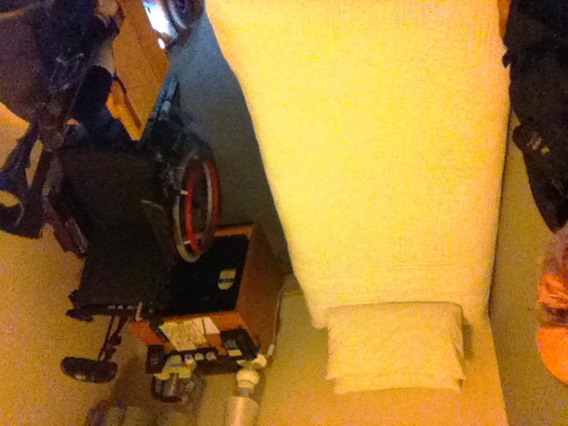 The mystery fifth wheel is a SmartDrive, a fantastic, lithium battery powered device that I ordered a fortnight ago after trialling several power-assist manual wheelchair systems in Melbourne. It really is stunning technology, (stunningly priced), fairly new on the market, and another example of the huge improvements of the last few years that I benefit from every day. With a range of 15km on flat ground, this little wheel pushes harder and faster than you can believe. It has amazing traction, and exactly copies the speed you set with the chair’s push rims. Steering and braking is also through the push rims, just like normal. A blue tooth connected wrist band with an accelerometer notices when you make a pushing motion and engages the motor immediately, and disengages as soon as you tap your hand on the rim, sending a vibration to the wrist band. It is brilliant inside shops, between shops, round the house, round the block, on grass, on carpet, everywhere. And it’s great fun too; far more engaging and satisfying than a regular power wheelchair. Particularly important is that it is physically demanding enough to avoid the trap of inactivity that I once fell into by relying too much on a power chair.